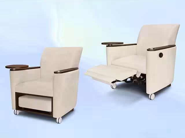 The theater lounge chair in senior living is first and foremost, comfortable. It is a chair you want to sit in for a long time, to enjoy a movie or attend a class or lecture. Kwalu’s Trentino Theater chair is exactly the chair you want. The foundation of this comfortable chair is the non-removable seat cushion with a fixed spring design. A stainless-steel back hand grip and back casters make the Trentino easily moved and positioned in the room. Combine the resting features of a recliner and the activity features of a theater chair and you have the Calabria Theater chair by Kwalu. It reclines only slightly, a good feature providing support for the user’s neck and back. A free-standing ottoman is an option and a motorized Calabria is available.