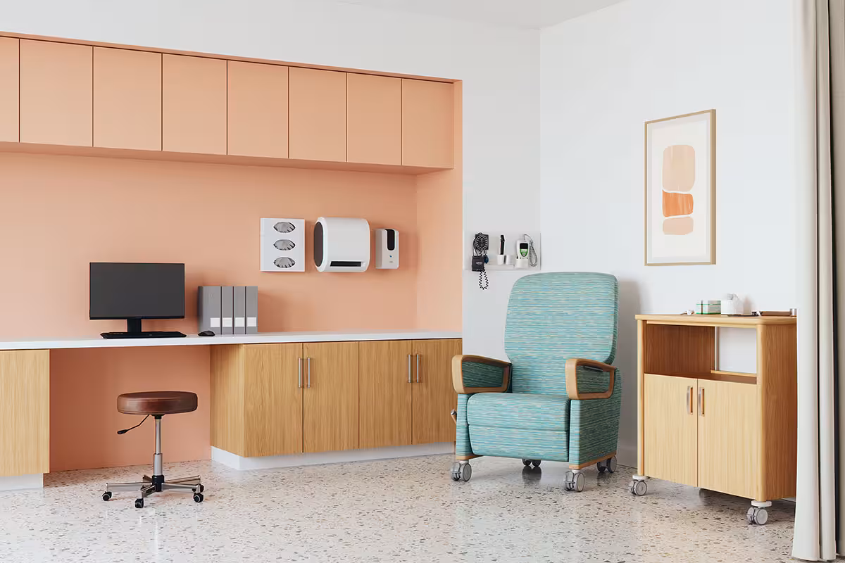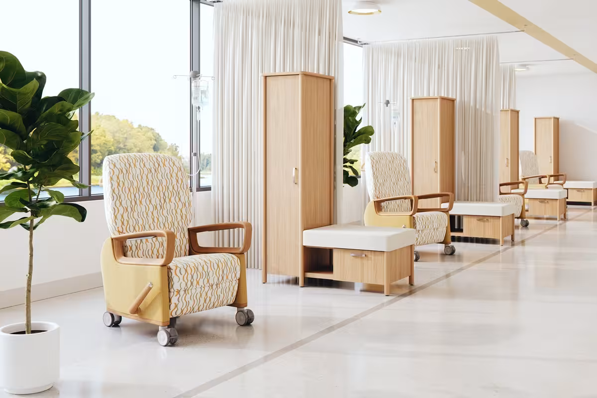 Patients often spend long stretches of time in treatment and infusion settings, returning regularly over the course of care. Furniture in these spaces should accommodate time in treatment and repeated use, while fitting naturally into clinician workflows.