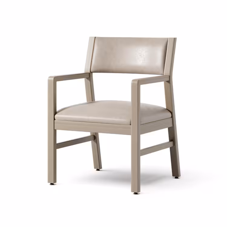 The armless version of the Caterina is a thoughtfully designed chair which features clean lines; a spacious removable seat, an angled upholstered back and wall saver back legs. Inset side seat rails provide a sturdy support to assist in navigating ingress and egress. The legs are connected by side stretchers. An armless slat back model is also available.