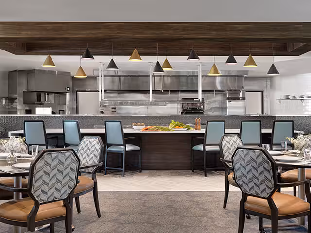 Dining in senior living is all about choice. Taking a note from the hospitality community, dining in senior living communities has become an experience. Cafes, beautiful formal and casual restaurants, and coffee shops boast farm-to-table offerings and chef-developed dishes. Kitchens here are locales where excellent chefs have cooking classes for residents and guests. Casual dining venues include intimate small group seating and bistros with bar and counter height seating support the new social level of dining in senior living.