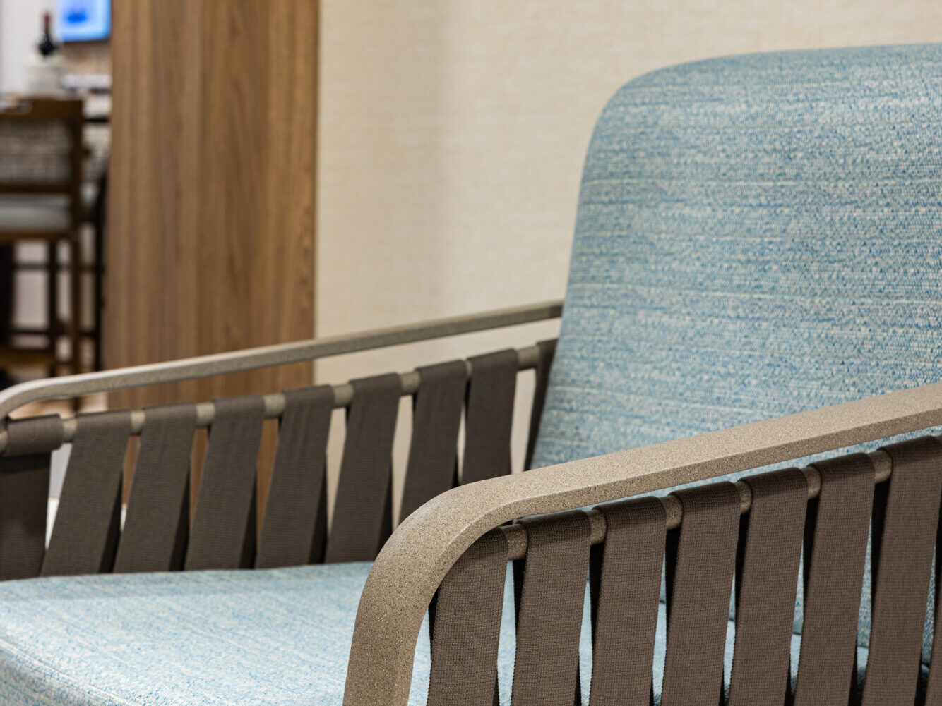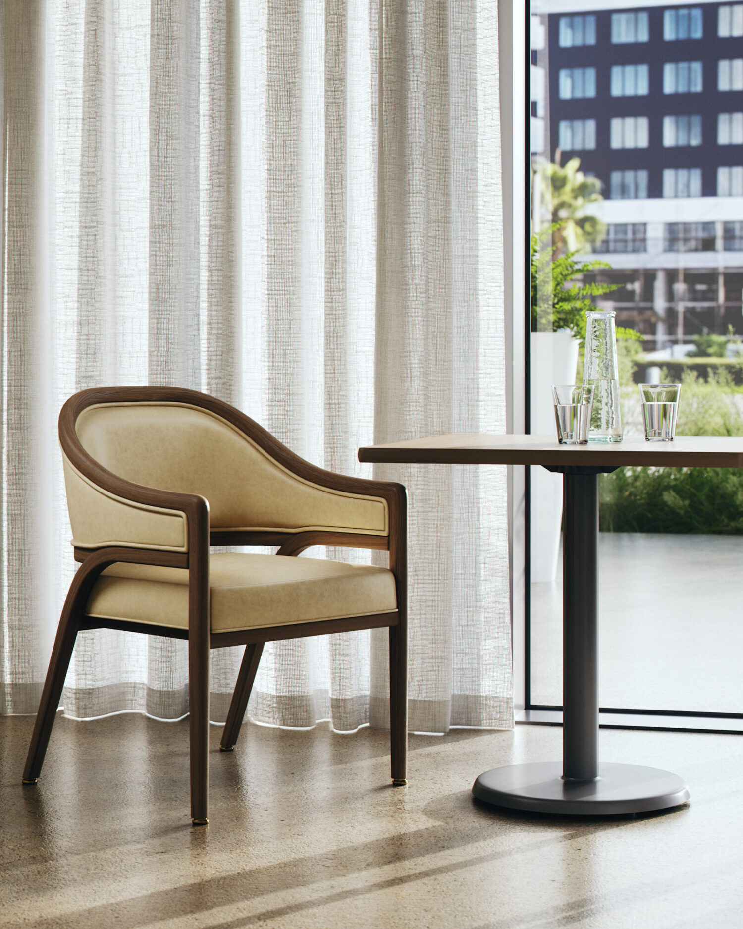 Shared spaces in senior living communities should be designed with intention—offering comfort, connection, and visual harmony. The Amara Lounge Chair brings that vision to life with its softly curved back and generously cushioned seat, creating an inviting place to relax, gather, or simply pause. A sweeping Protea™ accent wraps around the barrel silhouette and flows seamlessly into the legs, offering a distinctive design detail that adds warmth and movement to the room.