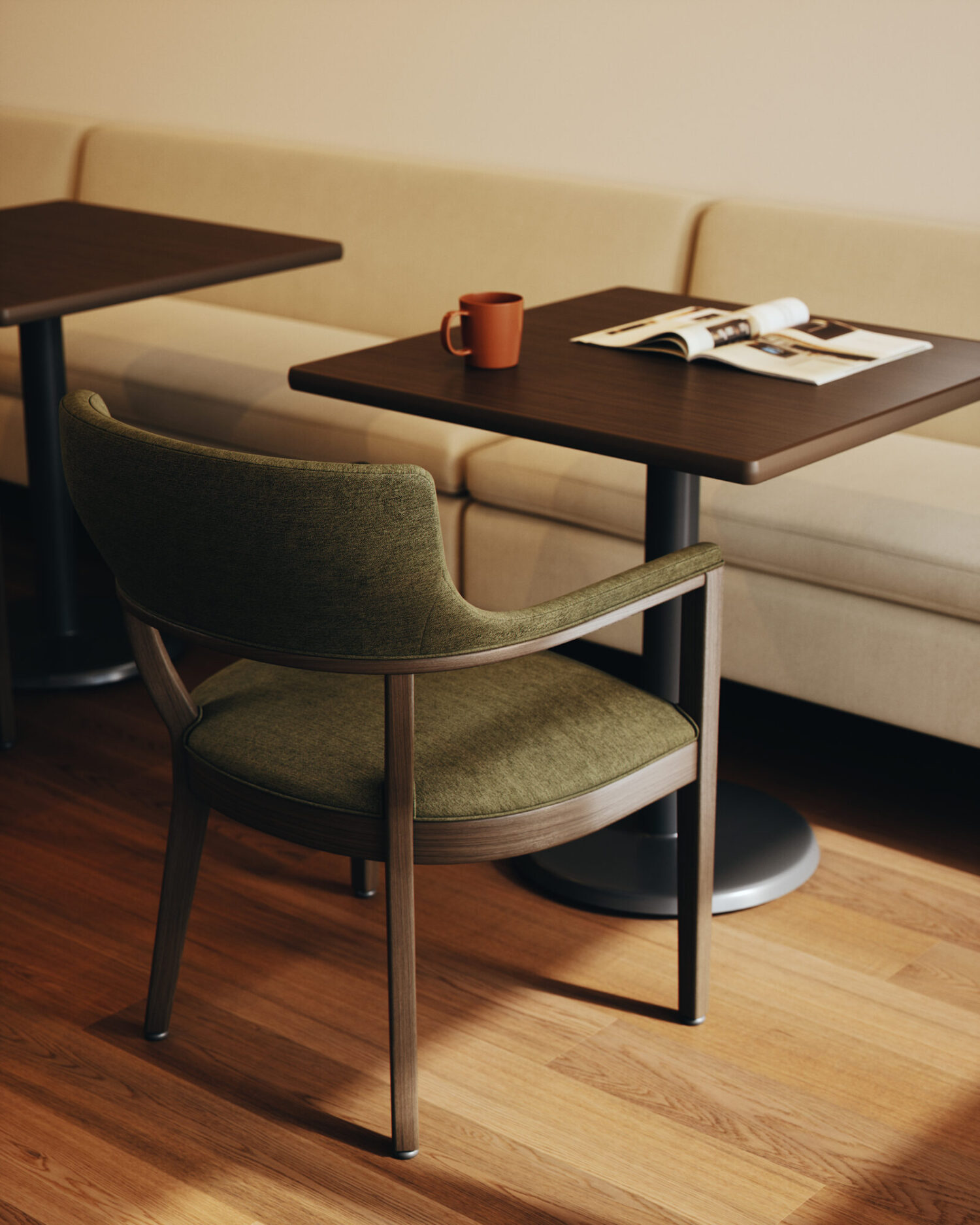 The Portici Dining Chair brings comfort and performance together in a design suited for both dining and activity spaces. Its arms, legs, back, and base are crafted with Protea™, our proprietary non-porous material that delivers the look of wood with added durability and cleanability. A visible cleanout supports maintenance in high-use environments, while optional features like a handgrip and front casters offer added flexibility. The Titan Table Base offers a modern, minimalist foundation. With a round base and centered column, it provides stability and simple form that works across a variety of dining settings and tabletop sizes.