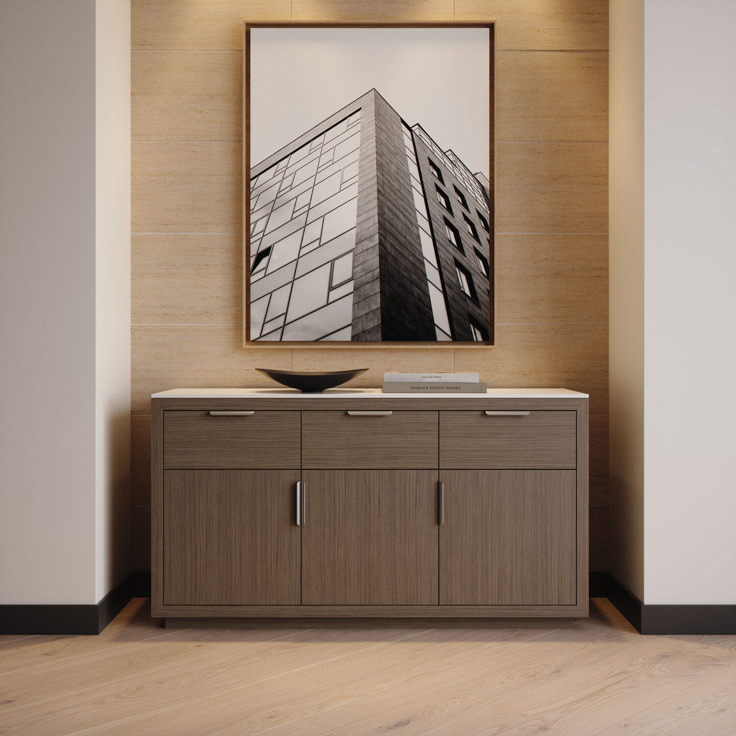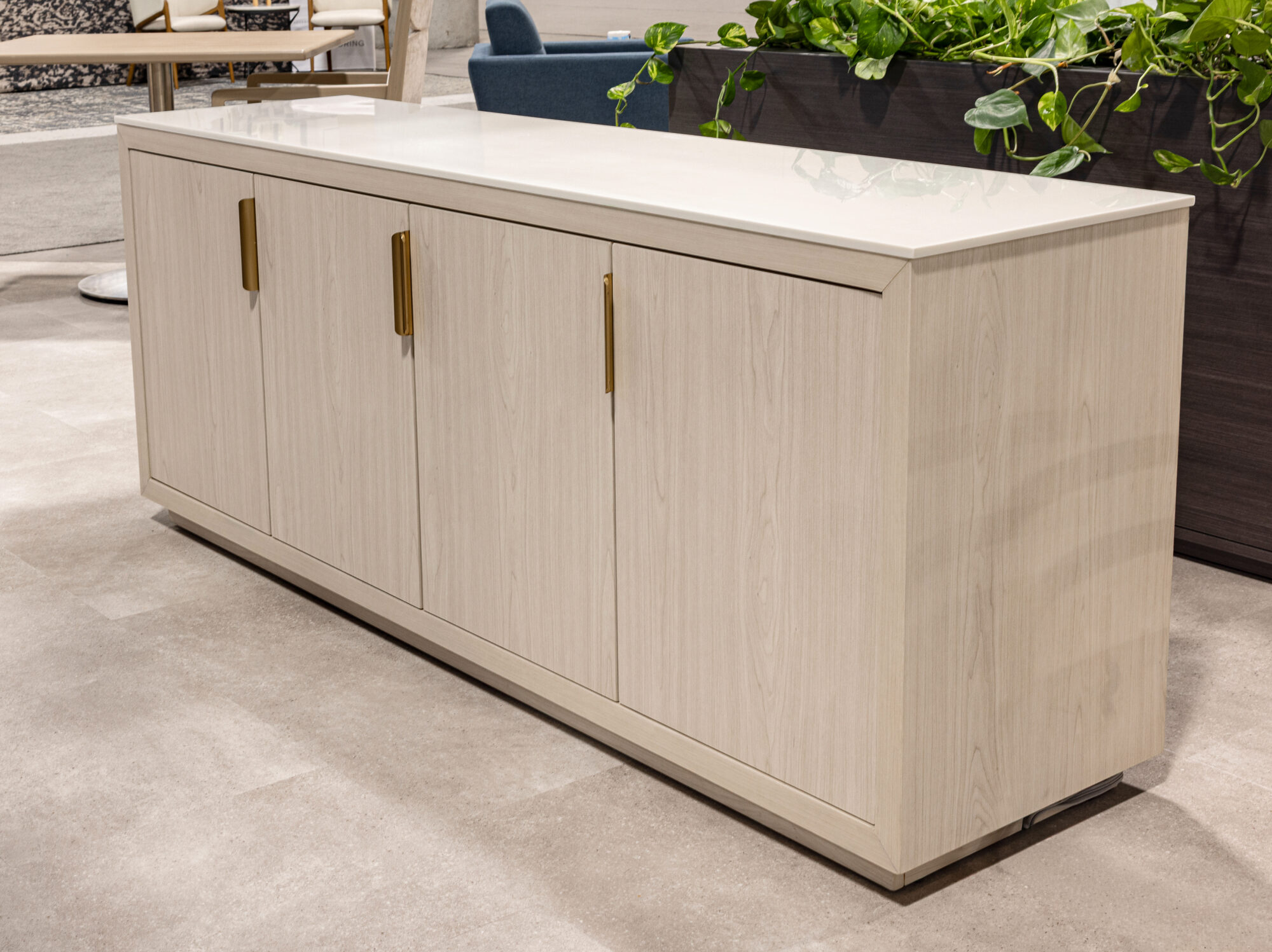 The Nashville Credenza carries the collection’s contemporary character into a larger storage piece, defined by its mitered face frame and clean, tailored lines. Crafted with Protea™ Fusion, it captures the warmth of wood grain while offering long-term durability, with solid surface top options available for added performance and material contrast. Designed for dining rooms and shared common areas.