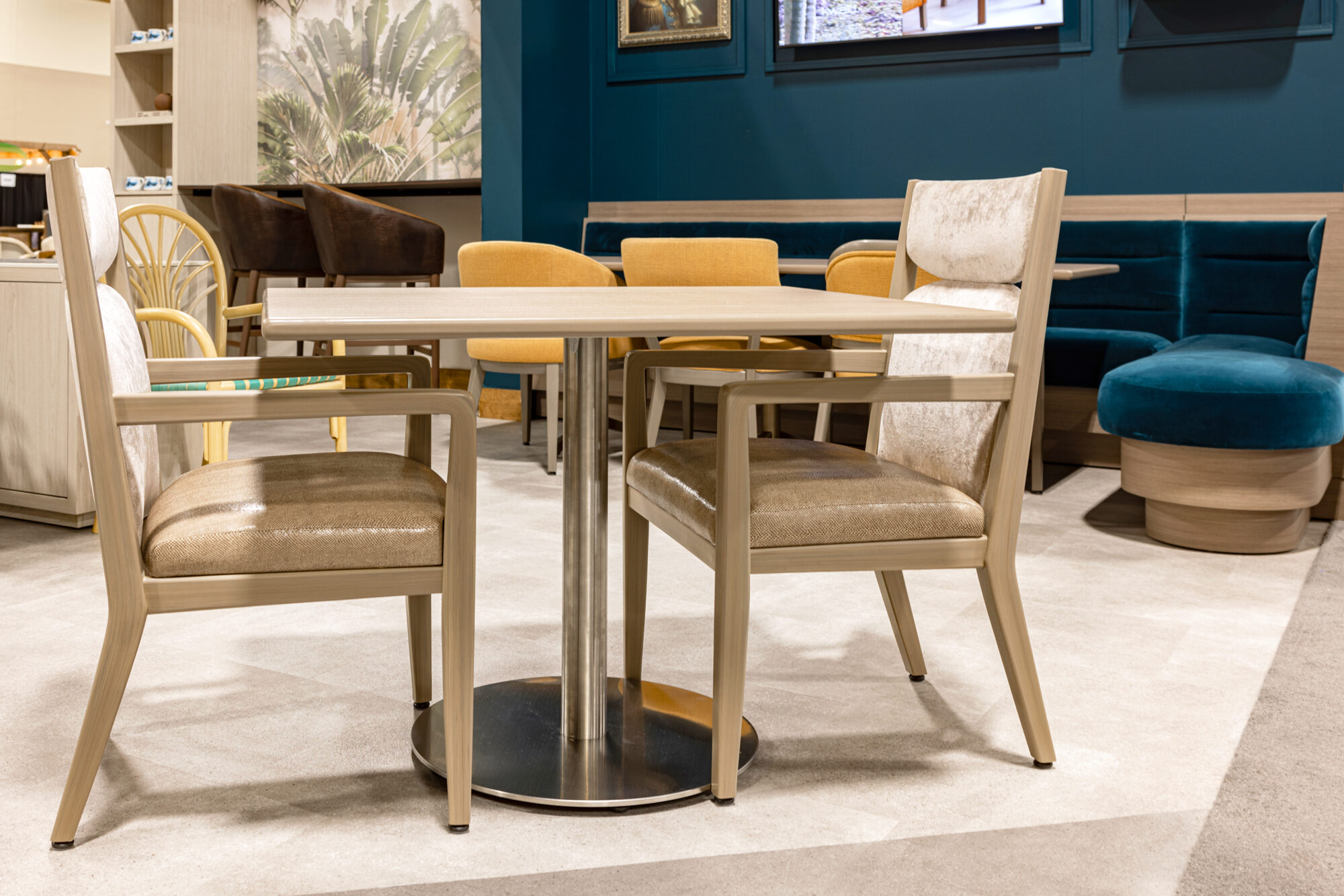Camber brings a lighter, adaptable seating option to senior living spaces. Compact proportions, slim arms, and a softly curved back shape the design, with an exposed Protea™ back panel that maintains material continuity across the frame. It transitions easily between dining rooms, cafés, activity spaces, and gaming areas.
