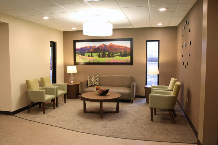 The Cortona Round Coffee Table adds visual impact to healthcare public spaces. A spacious round top rests on a compass base with a precision tiered apron, offering both function and lasting style.