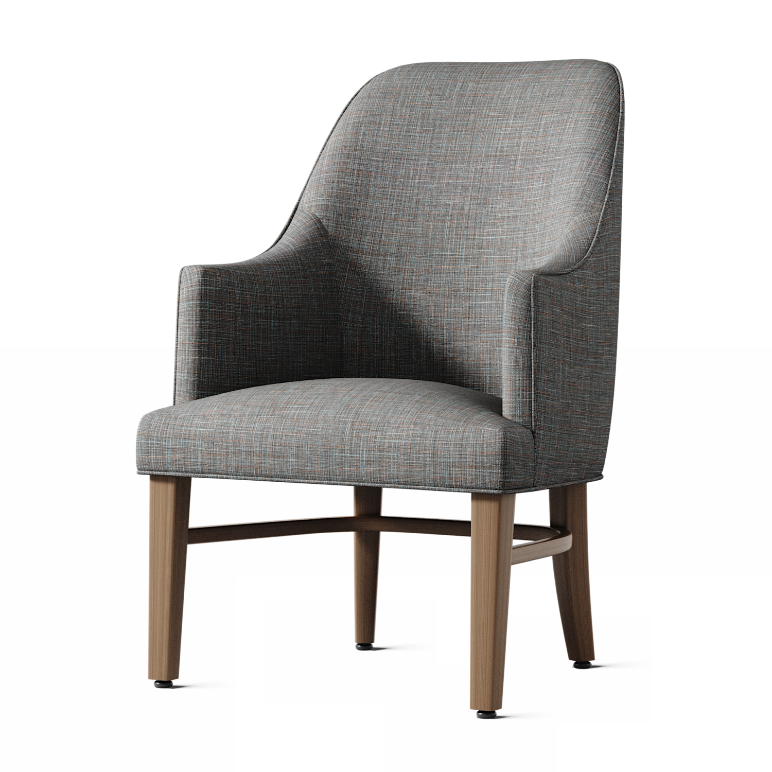 The Camarina Dining Chair balances form and function for senior living dining rooms. Its curved back and seamless arm-to-leg design create visual flow, while standard piping adds detail. The optional peek-a-boo back opening supports cleanability and debris control in dining settings.