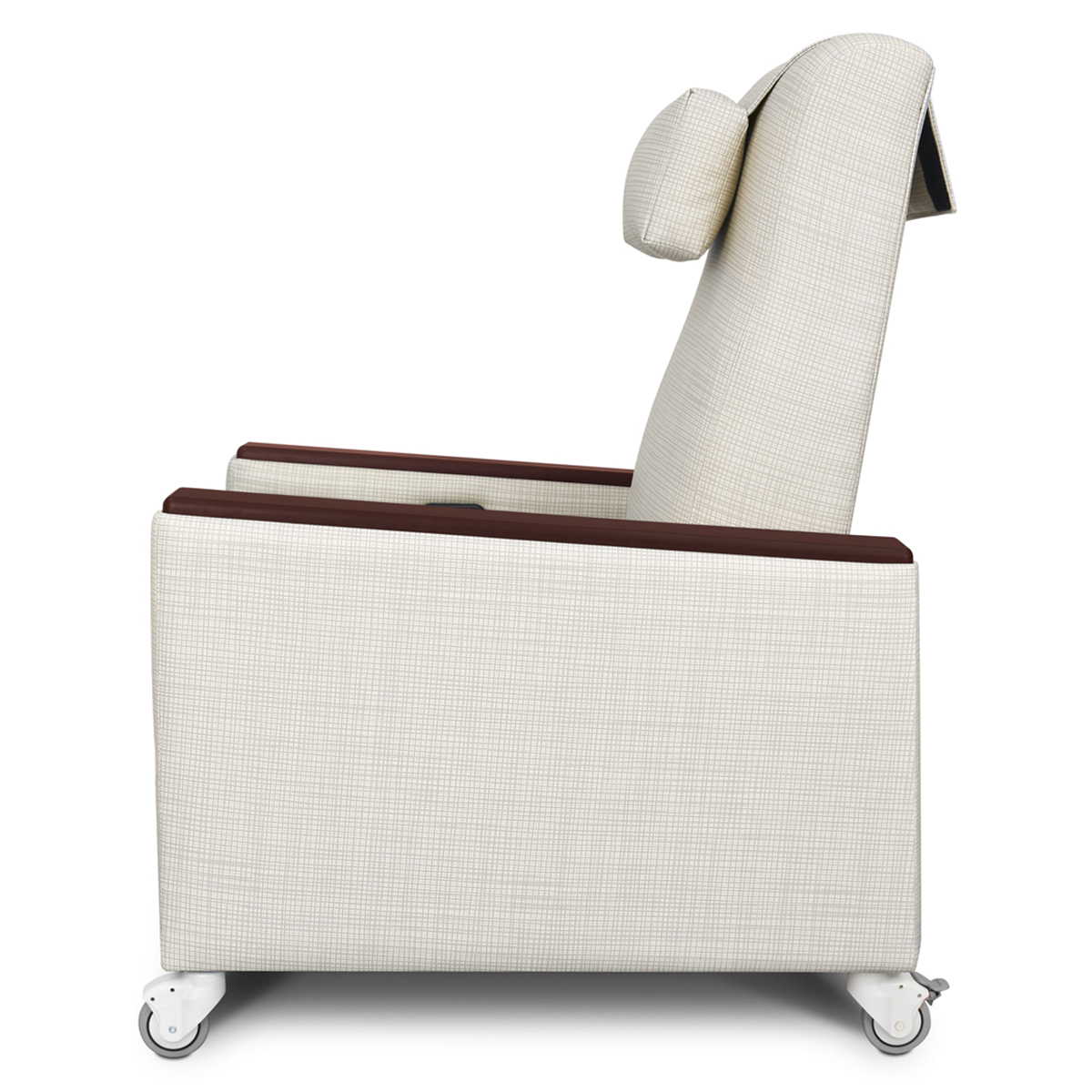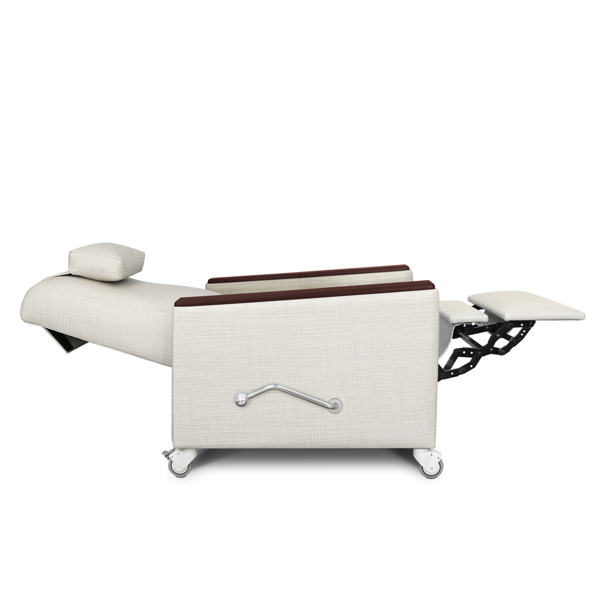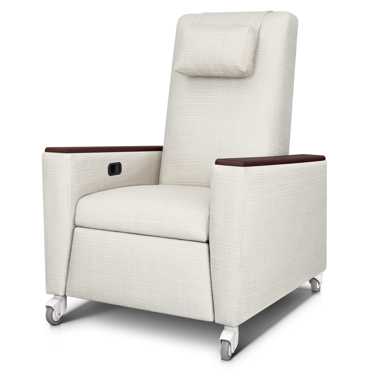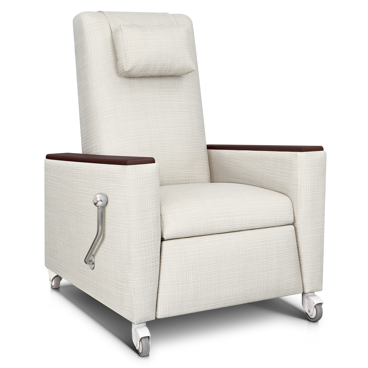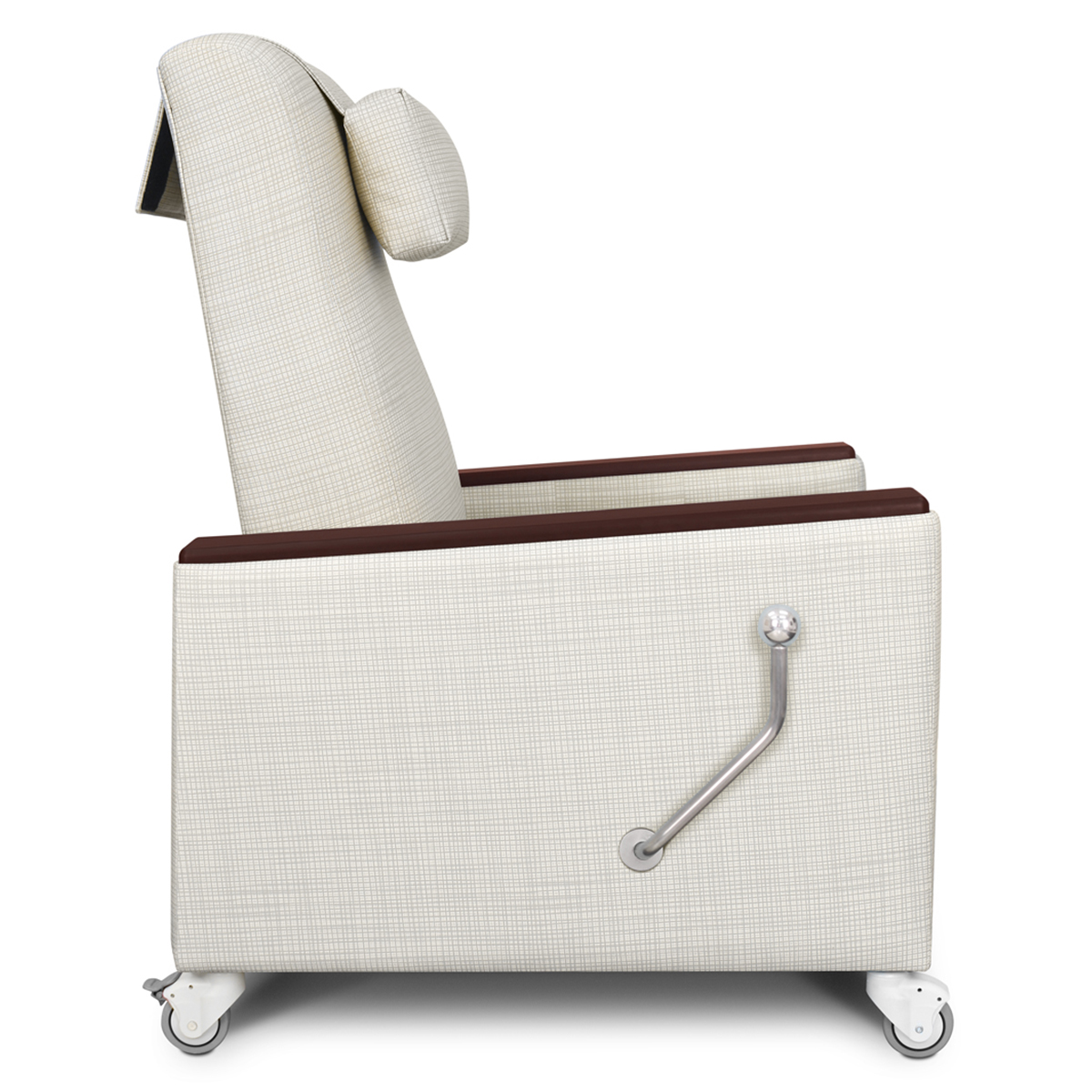 This Carrara Recliner fully reclines and locks into multiple recline positions, making it ideal for patient and care giver. A stationary head rest pillow adds comfort while locking and non-locking add safety.