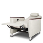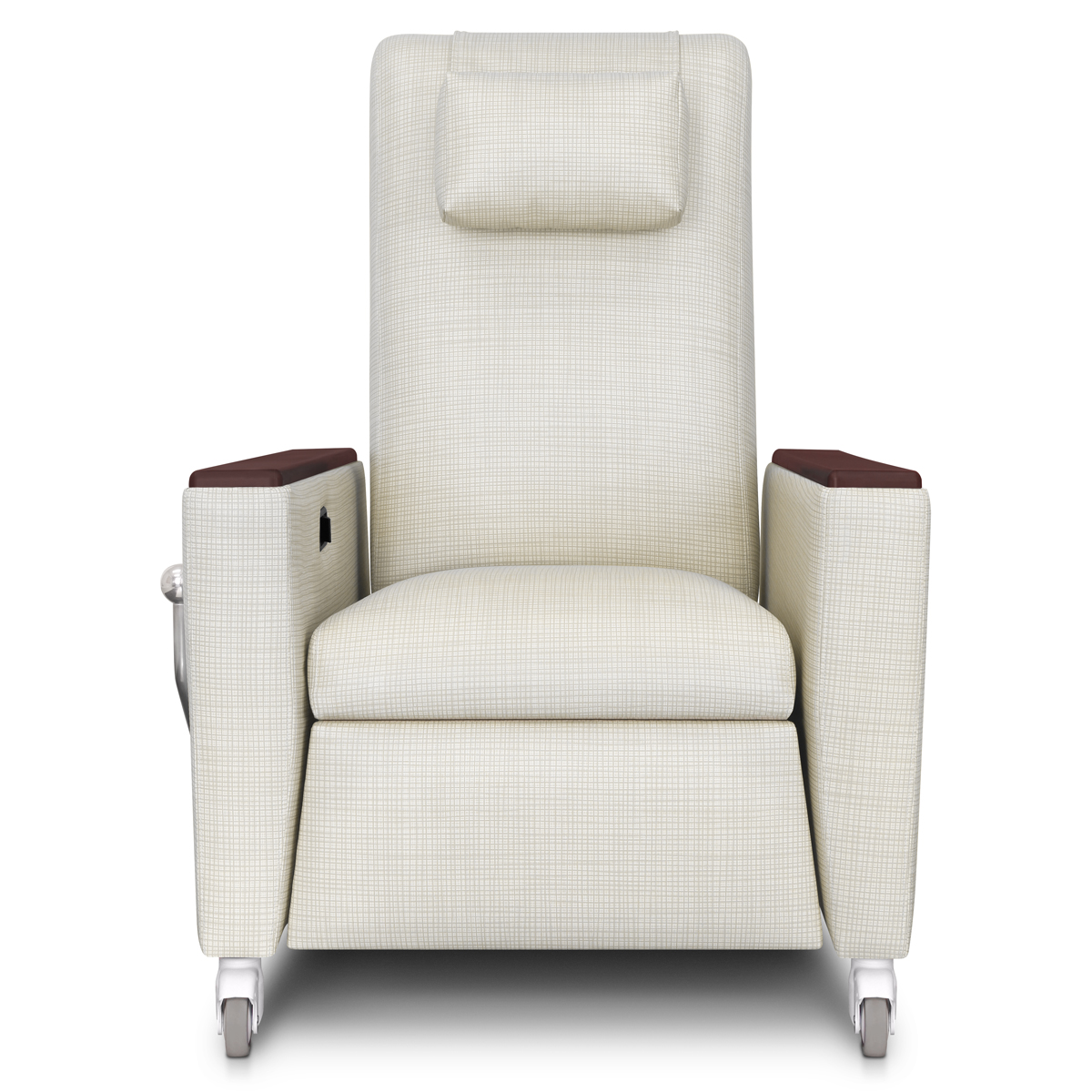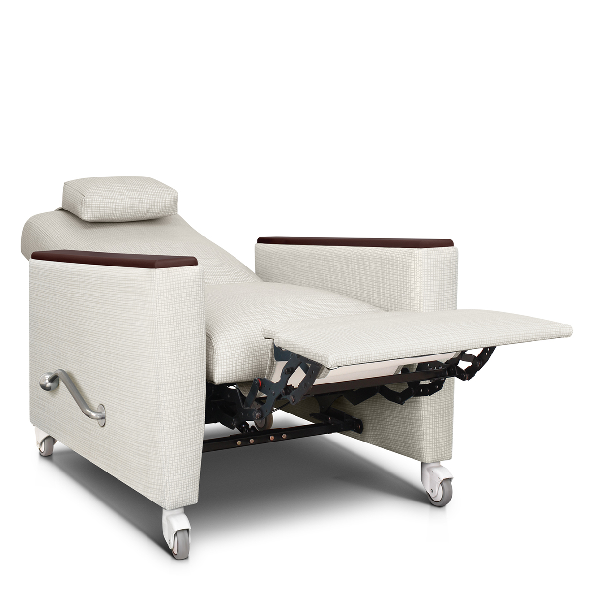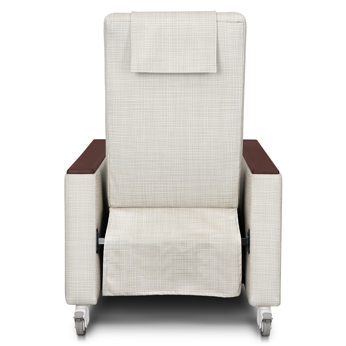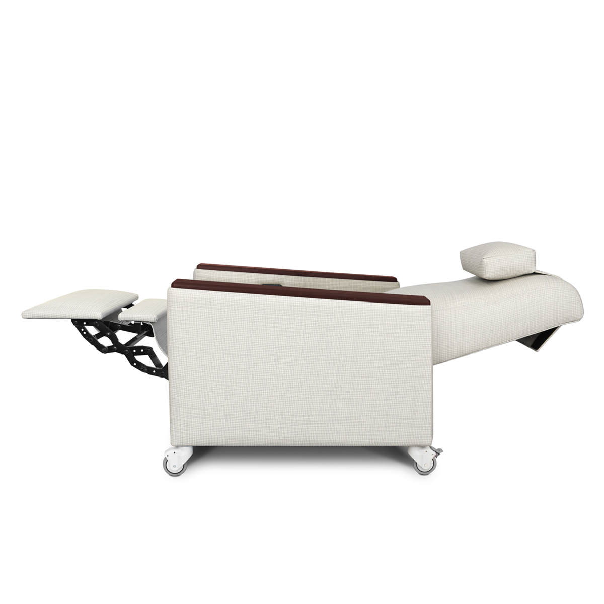 This Carrara Recliner fully reclines and locks into multiple recline positions, making it ideal for patient and care giver. A stationary head rest pillow adds comfort while locking and non-locking add safety.