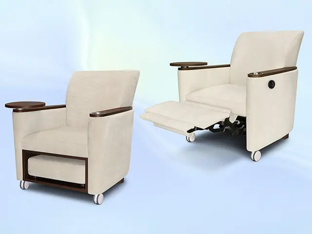 The most comfortable and flexible of the Kwalu theater chairs is the Calabria Collection. This collection combines a reclining action, where the resident can rest, and an activity model with an ottoman. The Motorized Calabria Theater chair only reclines slightly to support the user’s neck and back and the footrest can be raised, all with the touch of a button. In the chair with the ottoman, the resident can comfortably watch TV, participate in activities, and enjoy a meal.