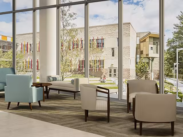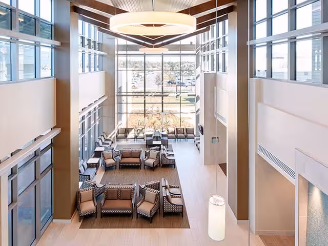 Large windows in lobbies, receptions and patient rooms of hospitals not only let in light but create beautiful views. When sick people can focus on the outdoors and brightly colored fabrics on indoors it takes the focus off of their condition. When visitors can look around a brightly lit room and can see that its clean their thoughts go to a healthy environment and they then have hopes of positive outcomes for their loved ones.